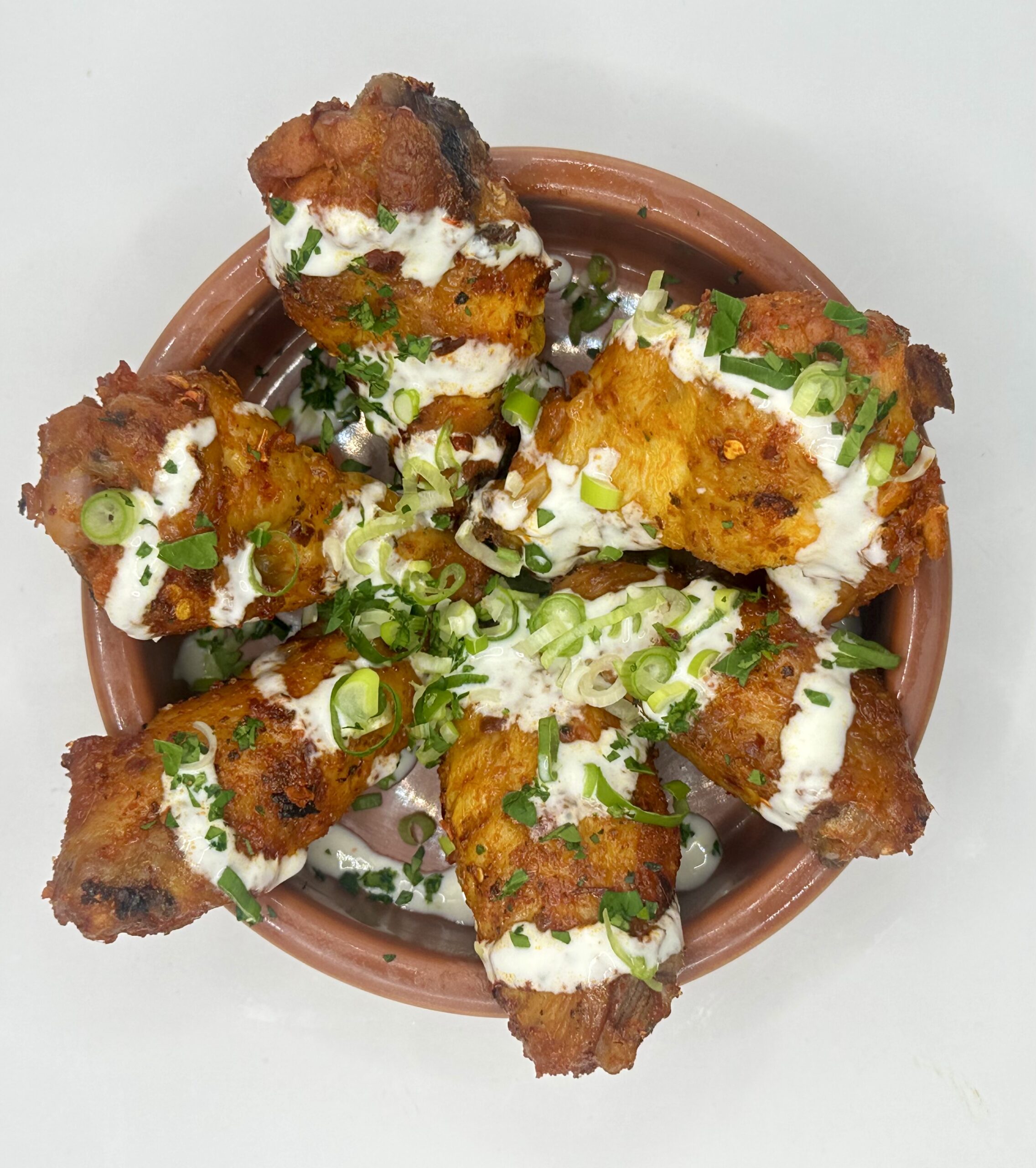 Sriracha & hot honey-glazed wings, garnished with scallions